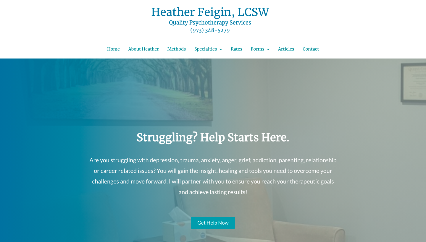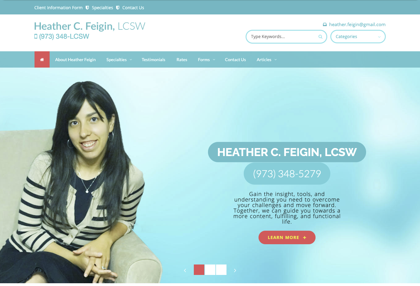 Heather Feigin, LCSW reached out to me for a website redesign. While it had suited her needs when it was built, the design was a bit dated, and she needed some new functionality to let her practice run more smoothly.
